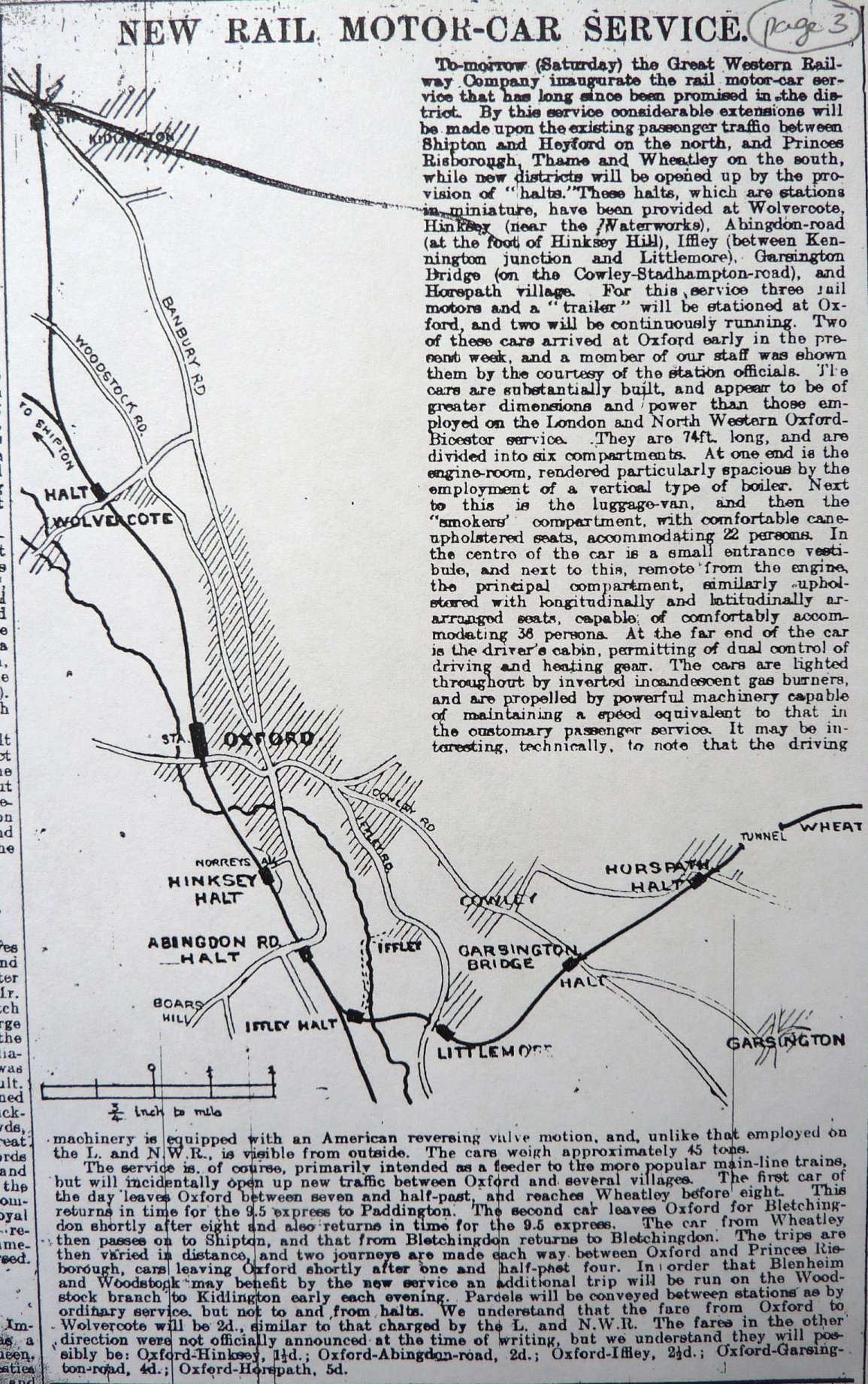 - Read the report in The Oxford Times (on 1 February 1908) of the launch of the railmotor service; it includes a map of the halts then in existence.