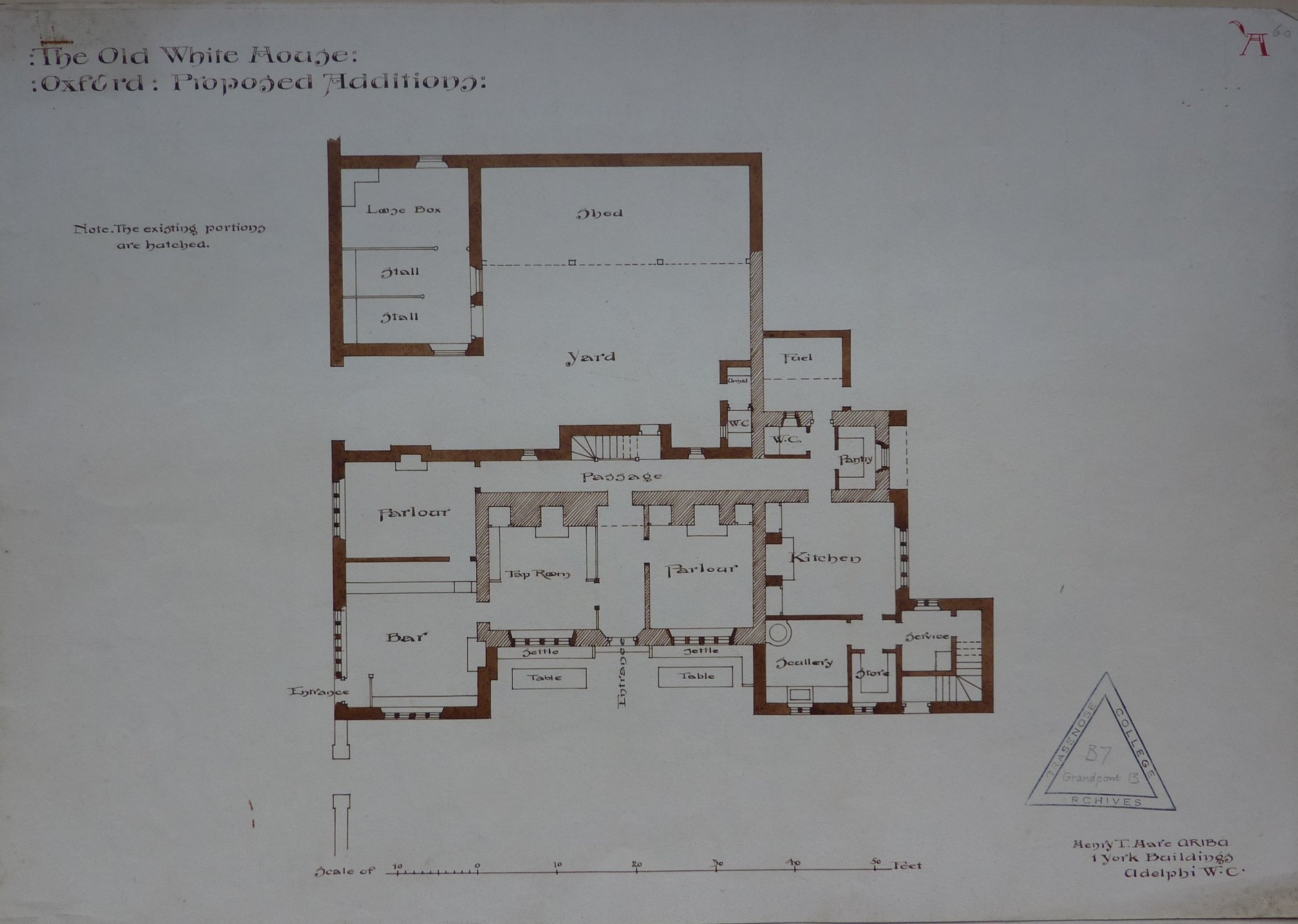 Plans drawn by architect HT Hare for additions to the Old White House pub, date unknown. Images courtesy of Brasenose College. (Click on either image to close)